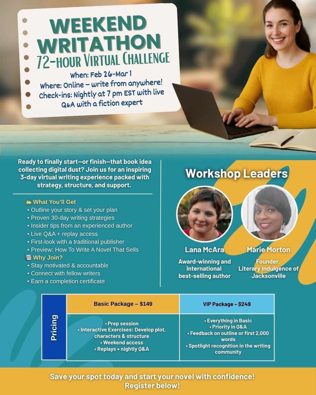 Register and make your plans to join us. Clear your schedule, get a sitter, book a hotel room, whatever you need to do to give yourself space to WRITE.
